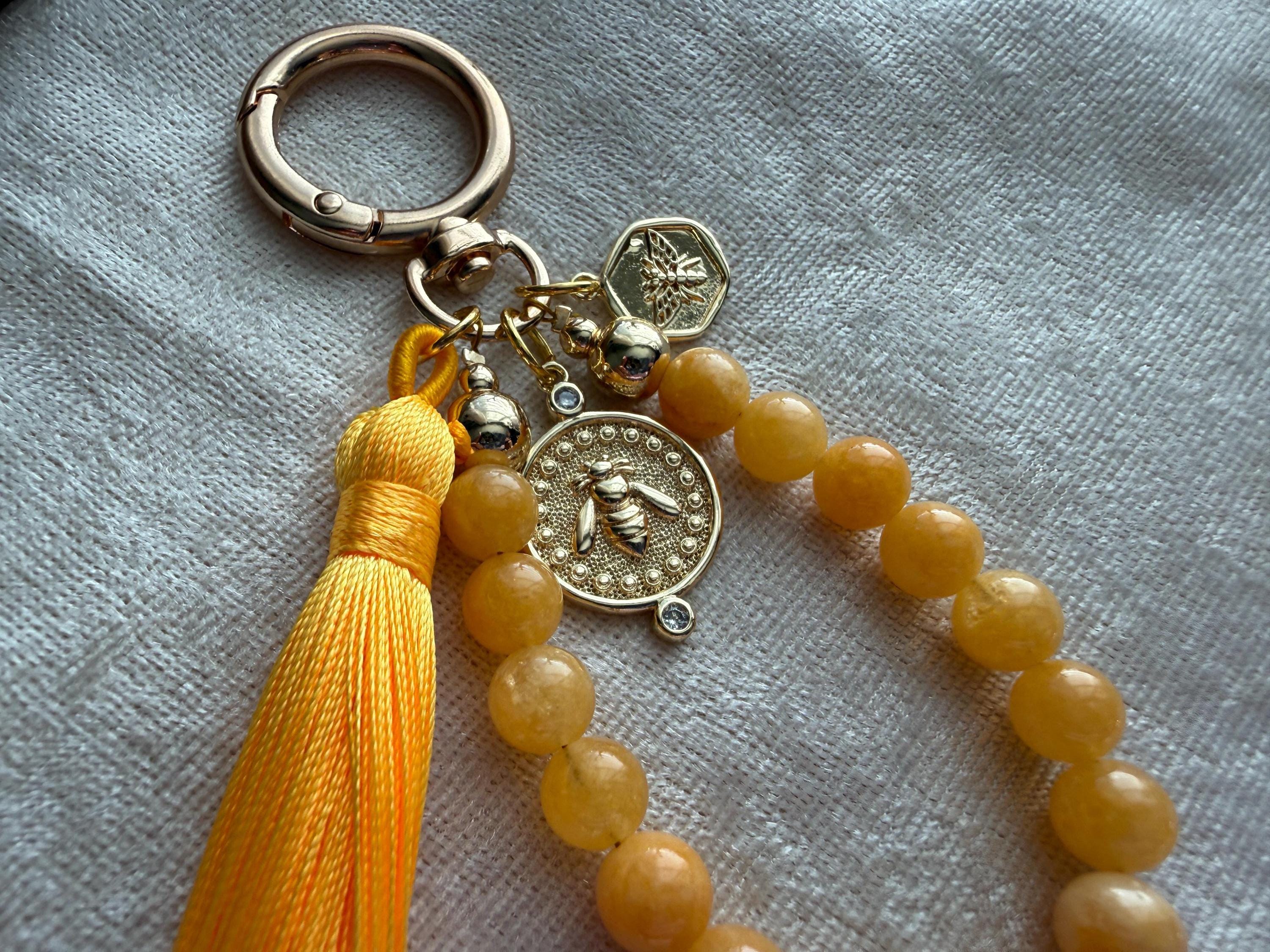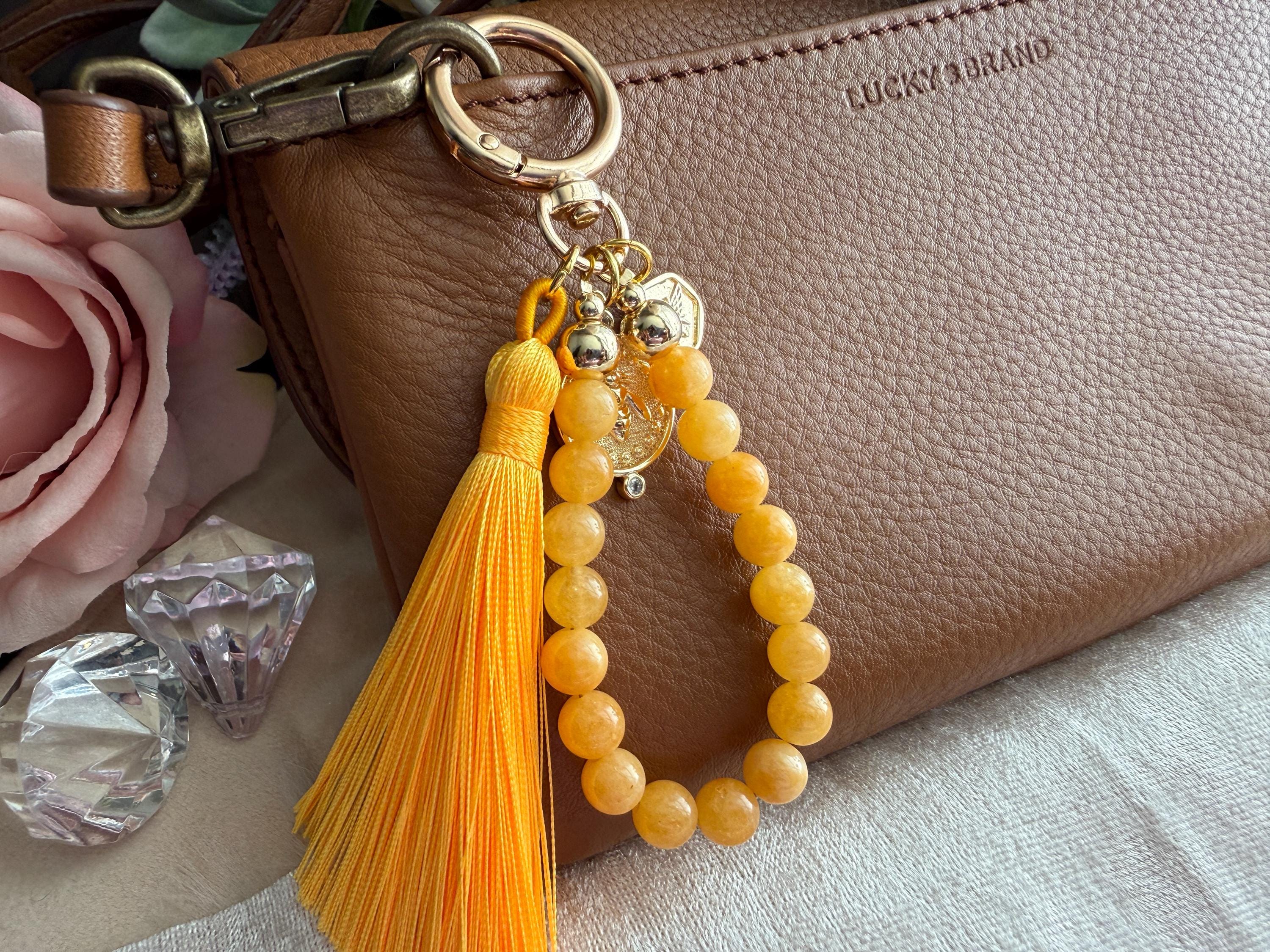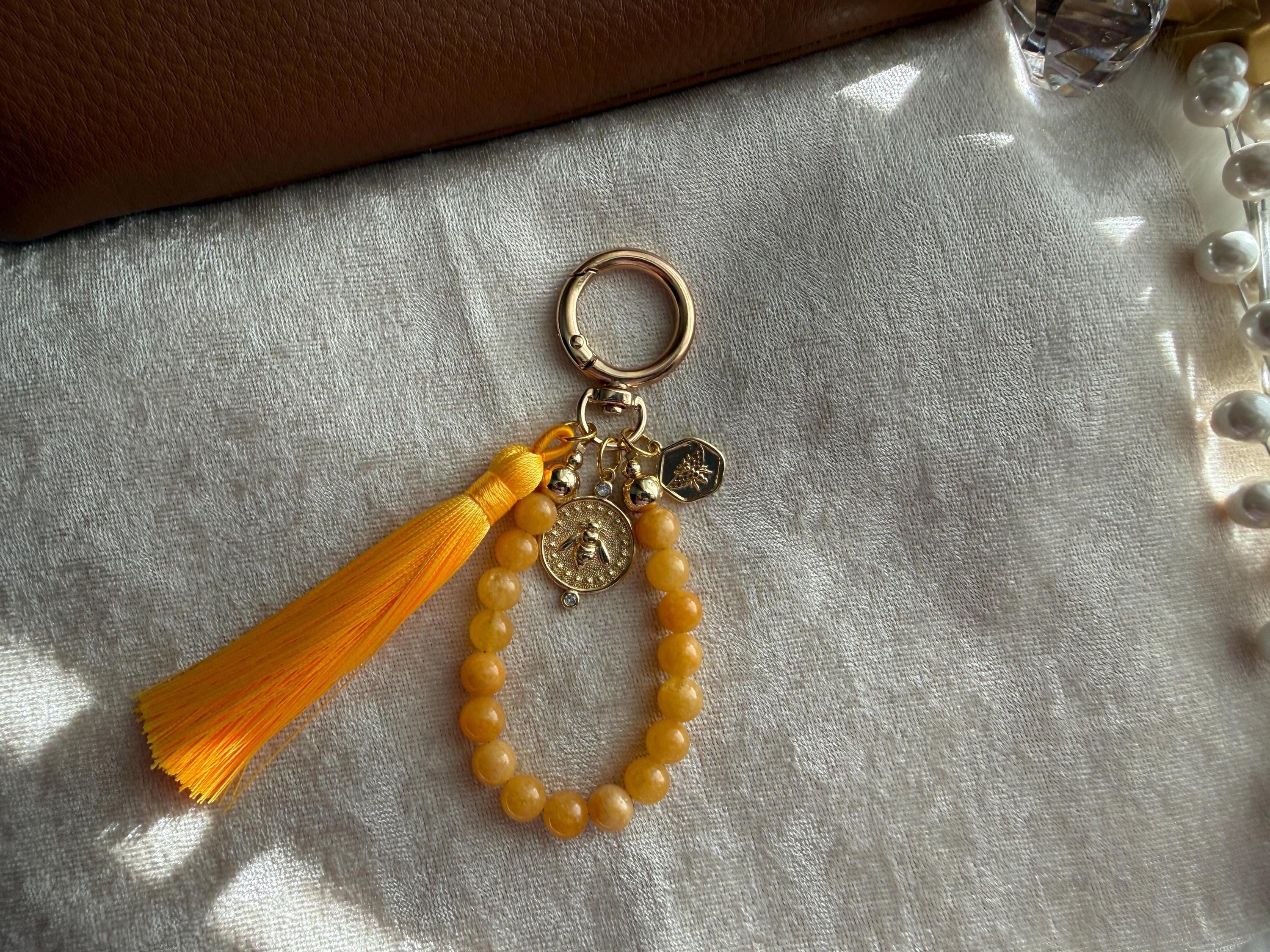 Add a touch of charm and sparkle to your purse, tote, backpack, or keys with this handcrafted gemstone purse charm. Made with honey yellow Chalcedony gemstone beads, a silky matching tassel, and premium gold-tone hardware, this piece brings a soft, feminine elegance to any accessory.
