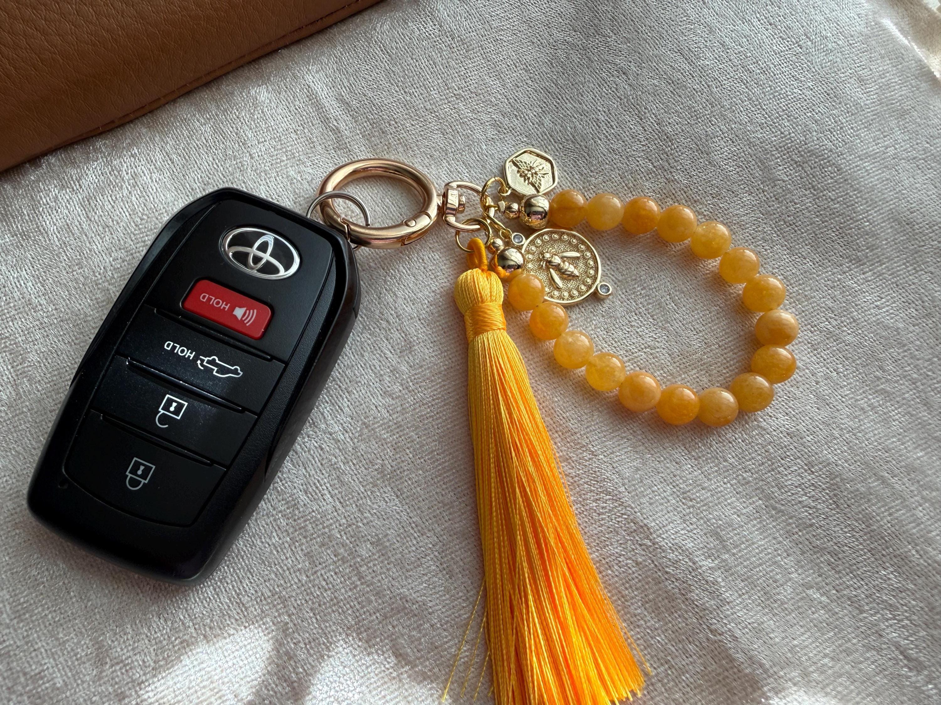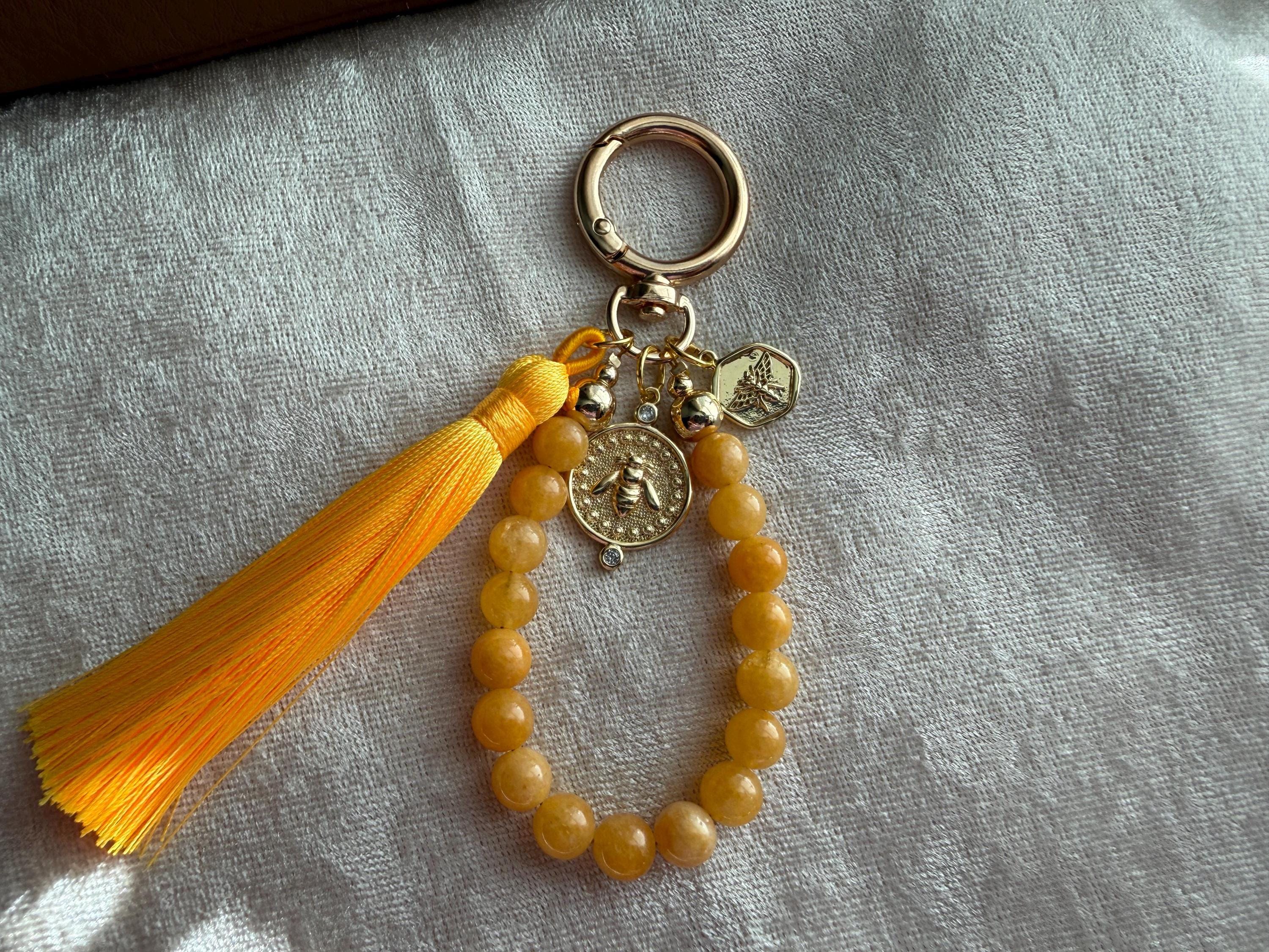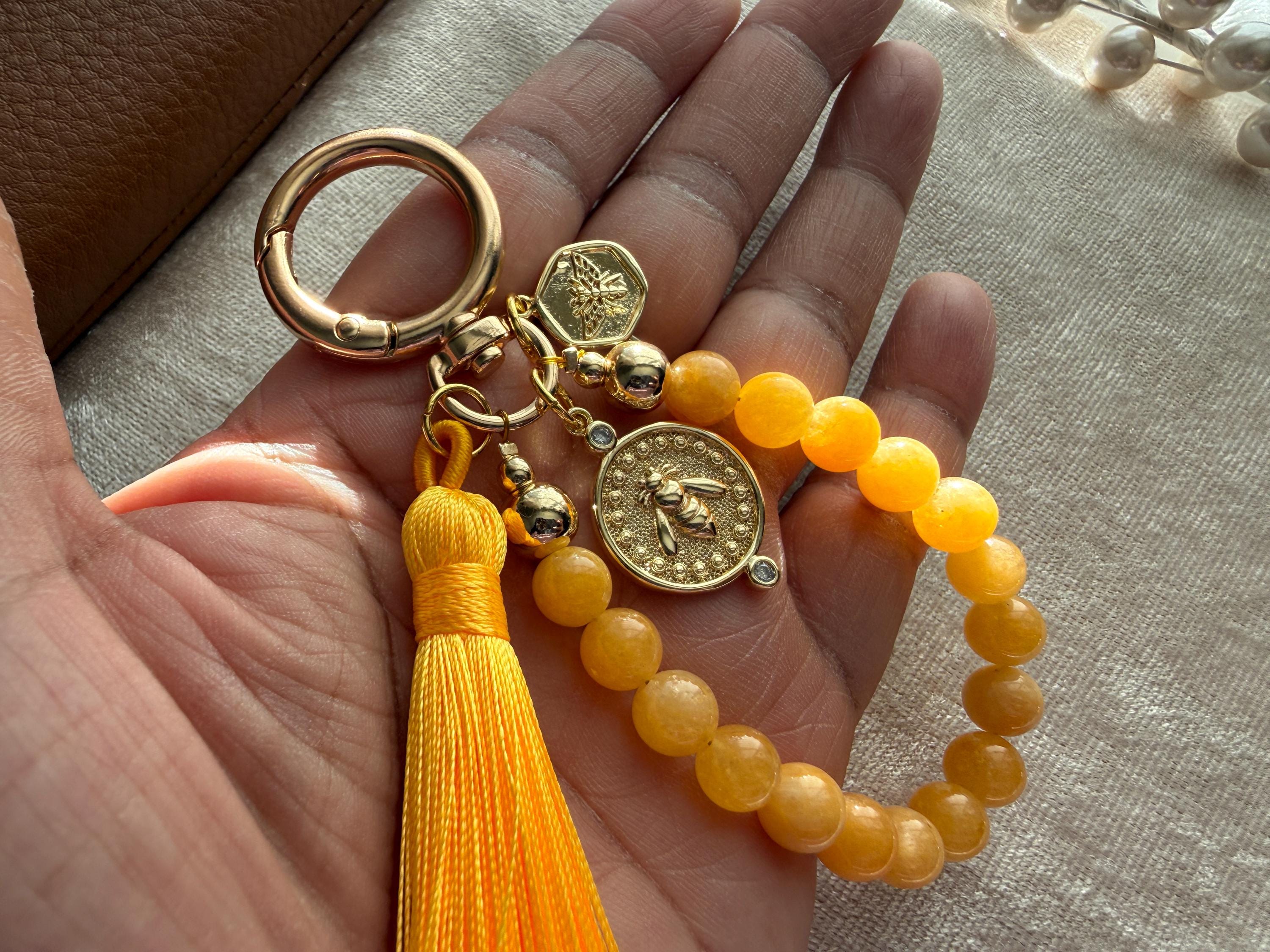 Add a touch of charm and sparkle to your purse, tote, backpack, or keys with this handcrafted gemstone purse charm. Made with honey yellow Chalcedony gemstone beads, a silky matching tassel, and premium gold-tone hardware, this piece brings a soft, feminine elegance to any accessory.