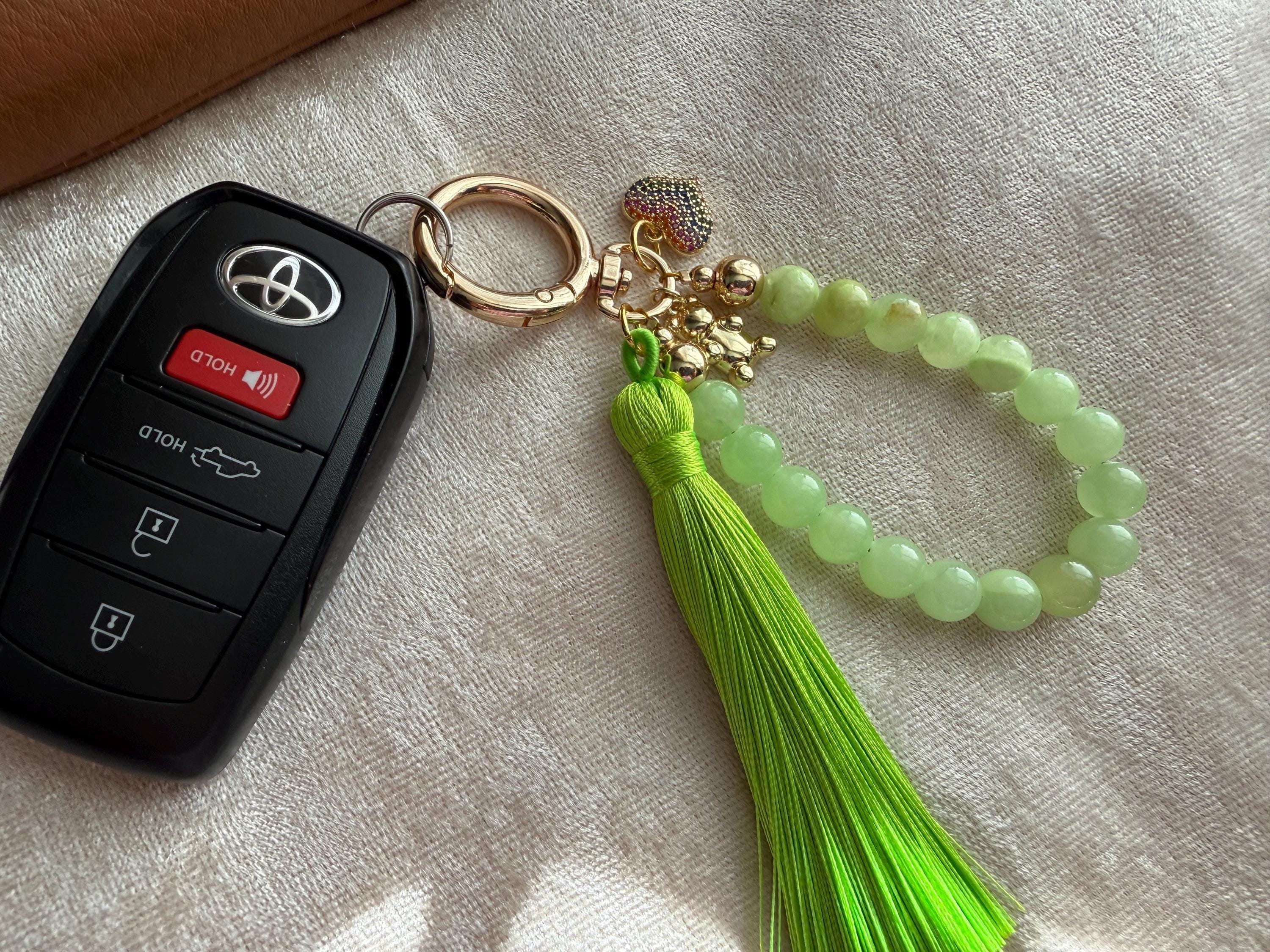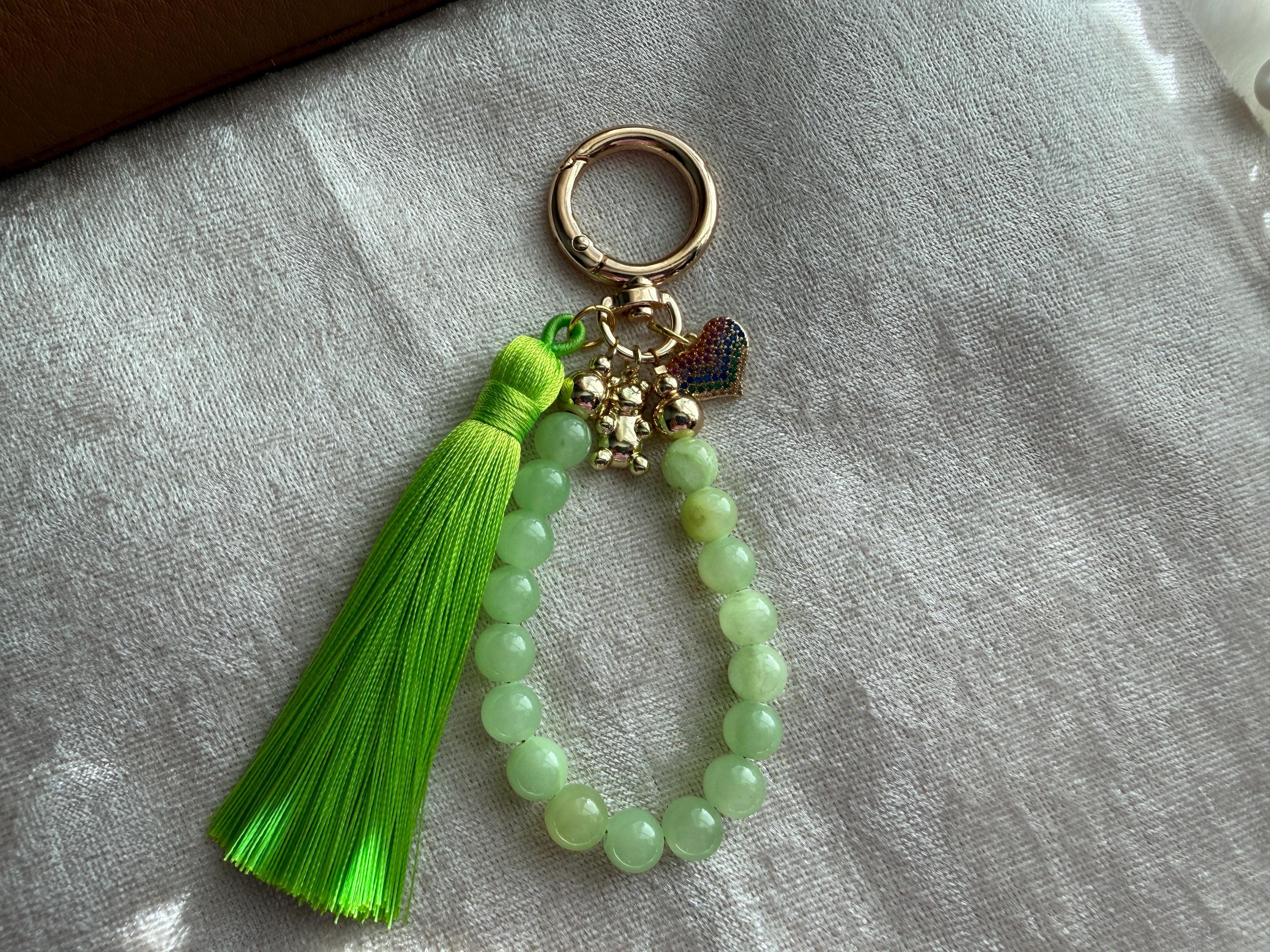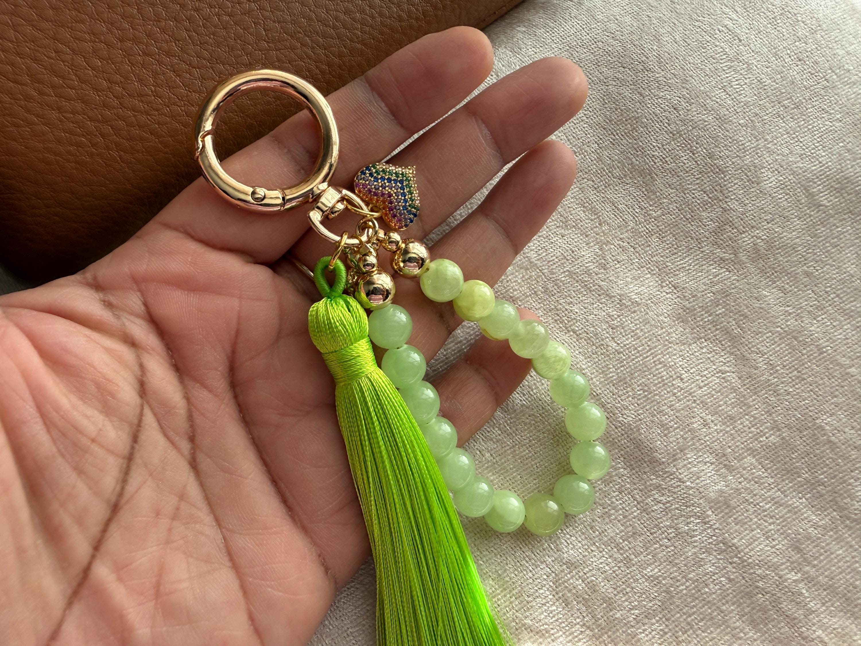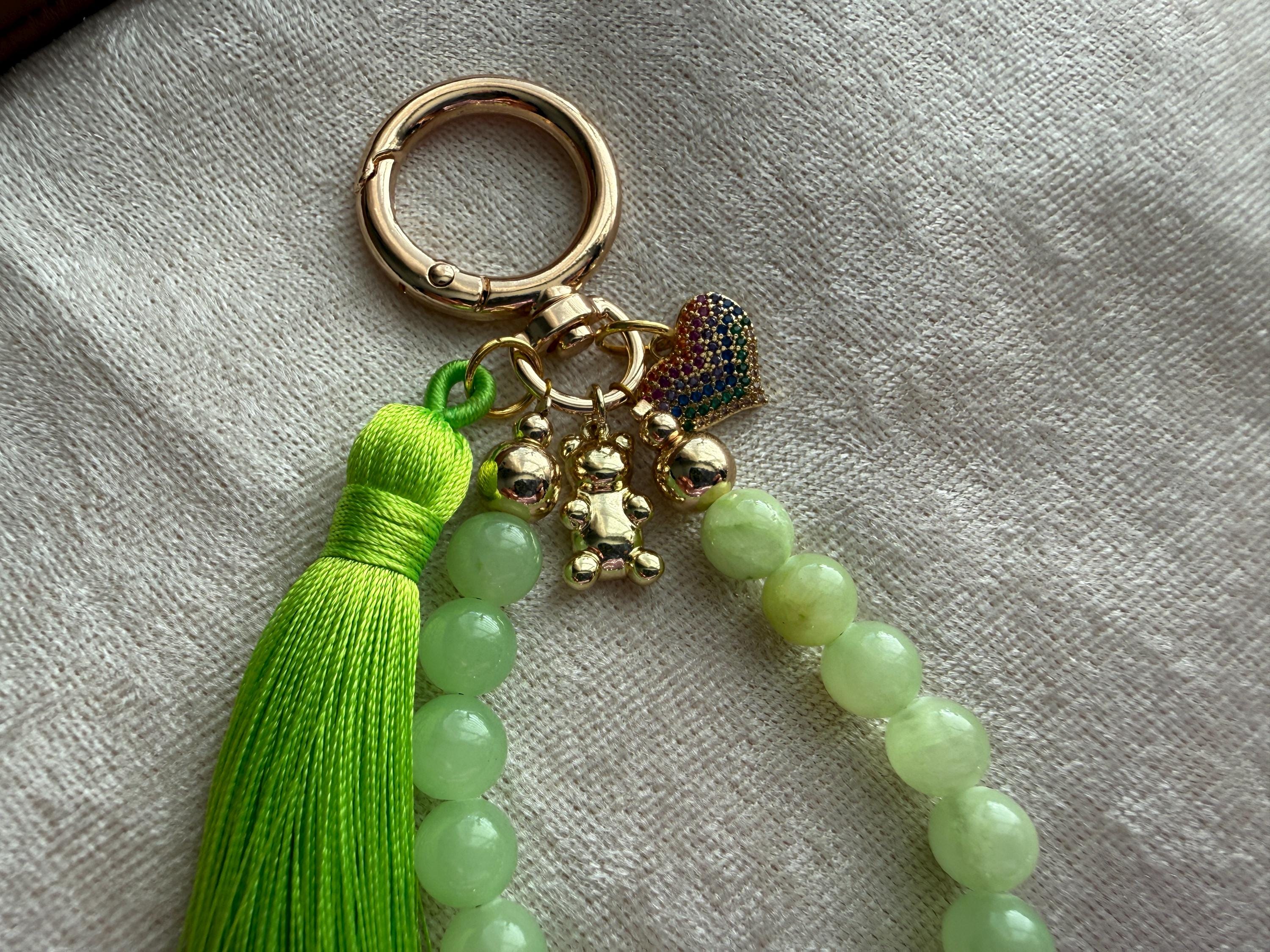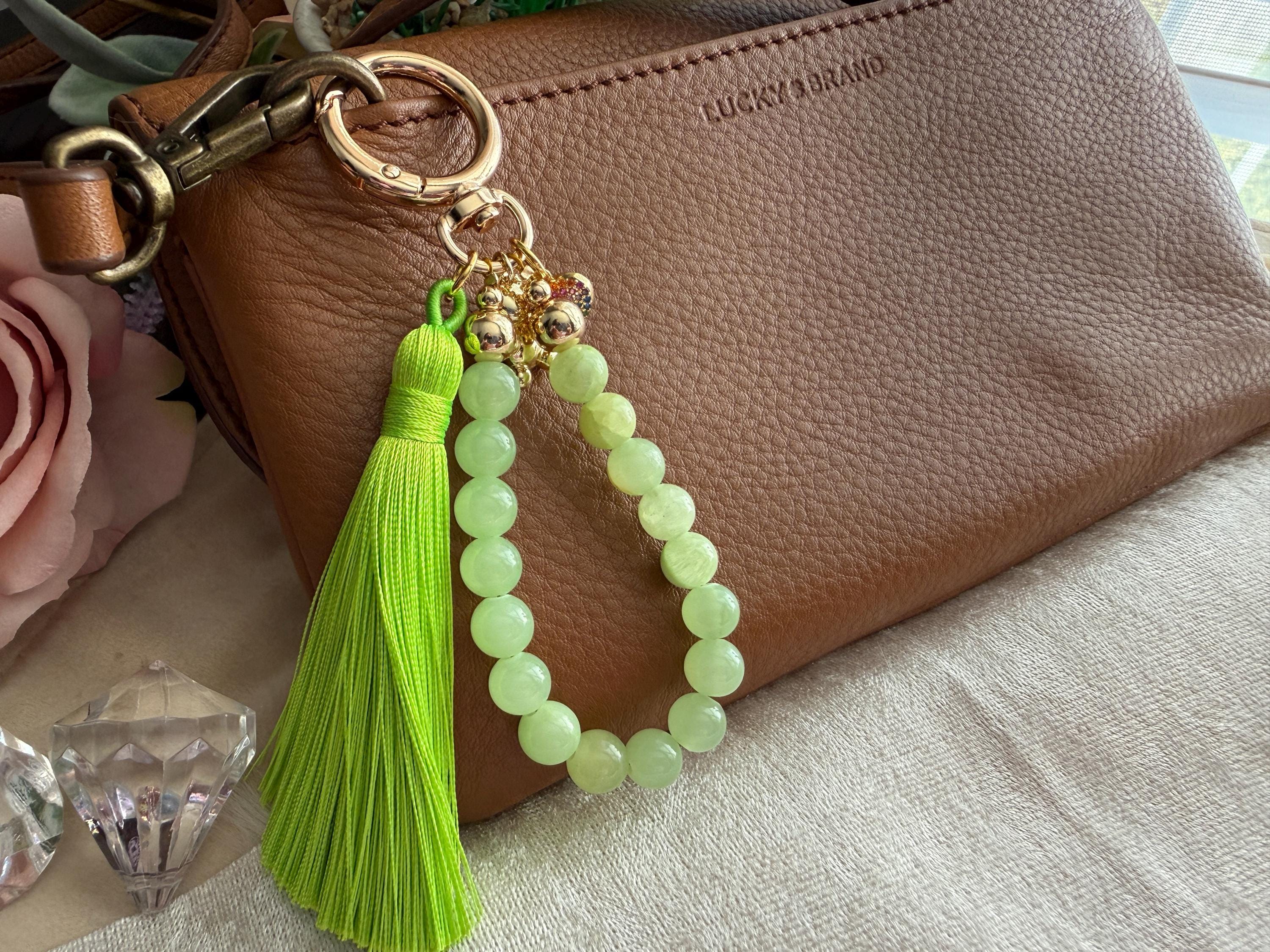 Add a touch of charm and sparkle to your purse, tote, backpack, or keys with this handcrafted gemstone purse charm. Made with lime green calcite gemstone beads, a silky matching tassel, and premium gold-tone hardware, this piece brings a vivid pop of color and energy to any accessory.