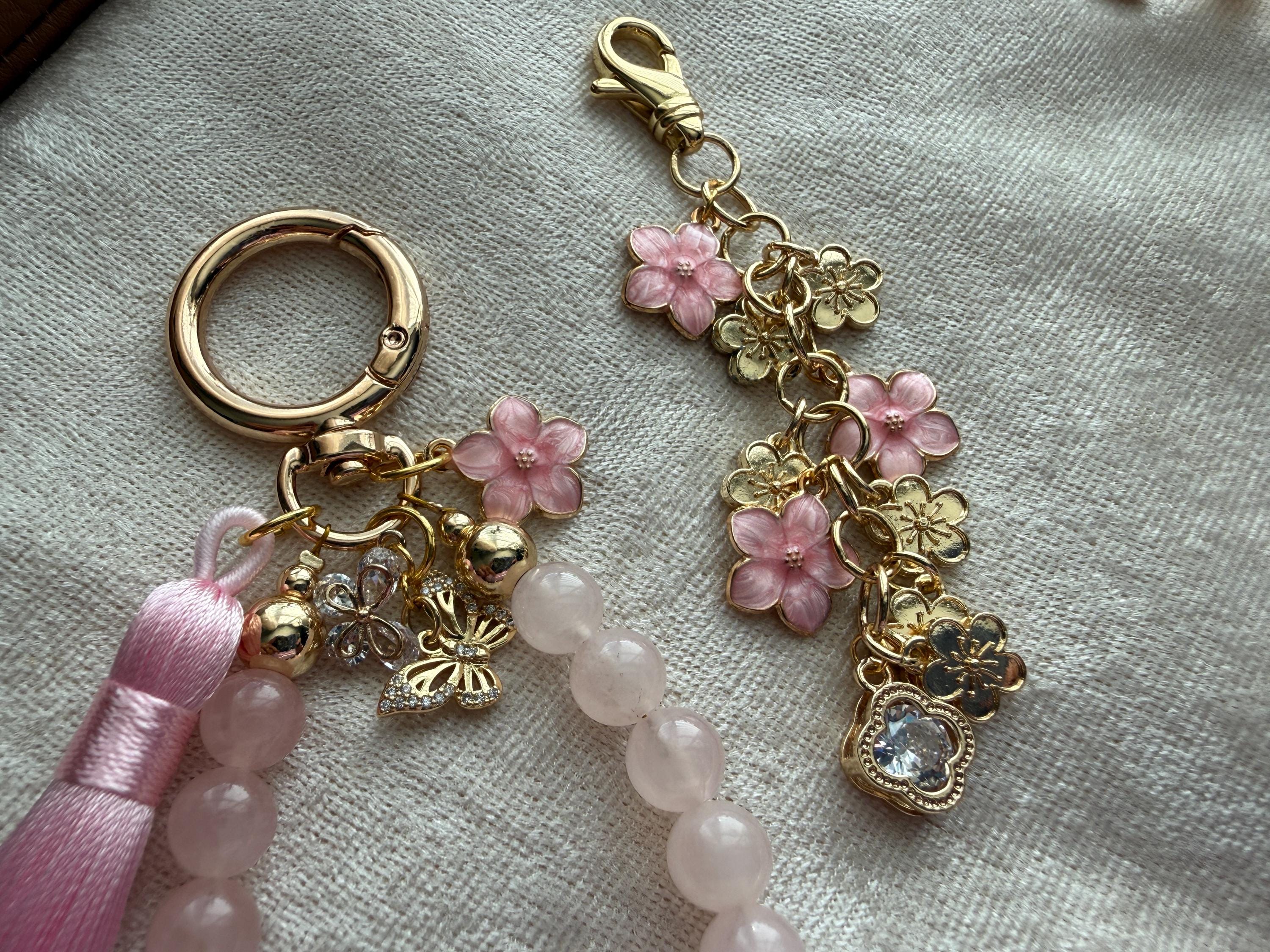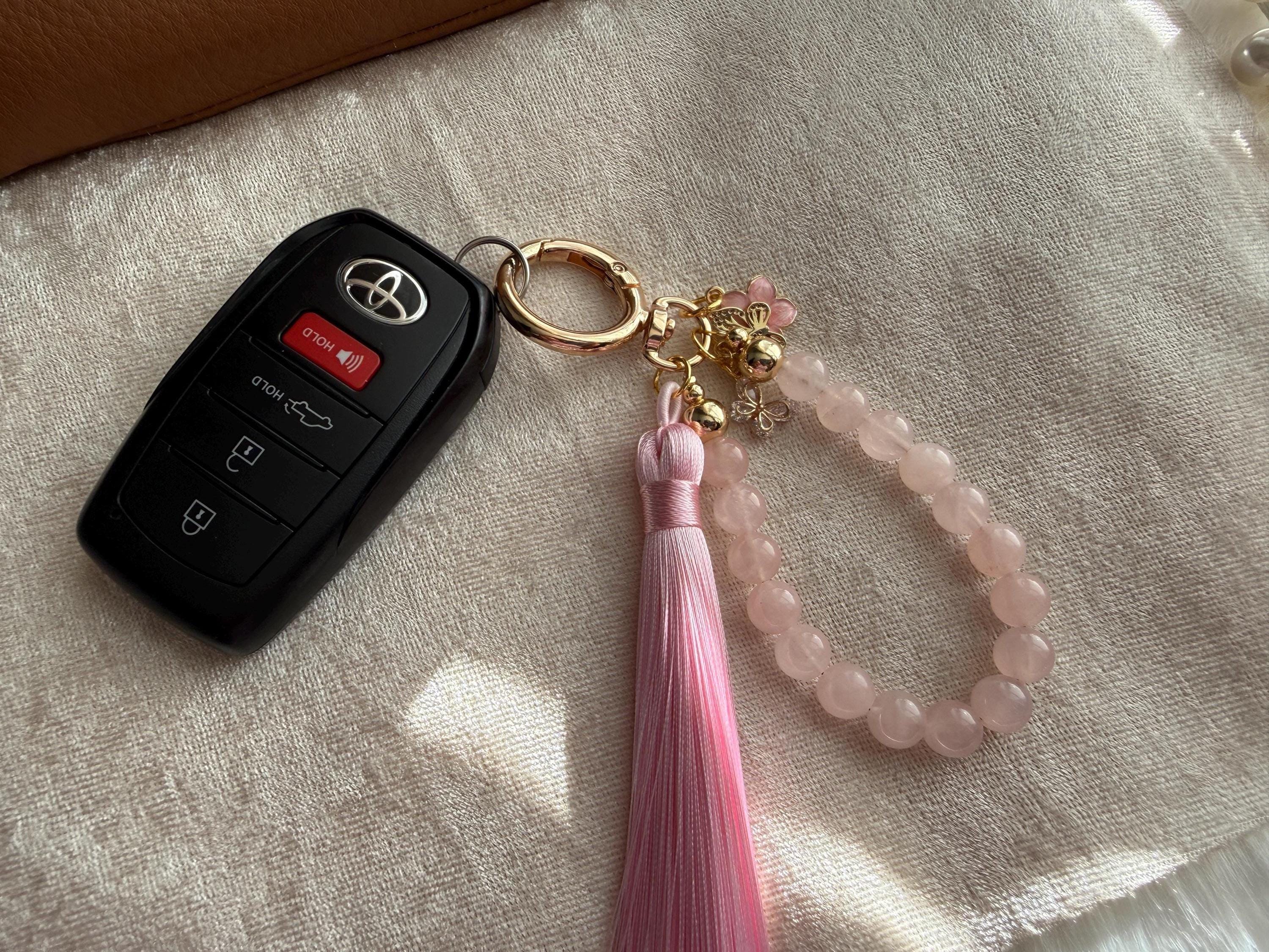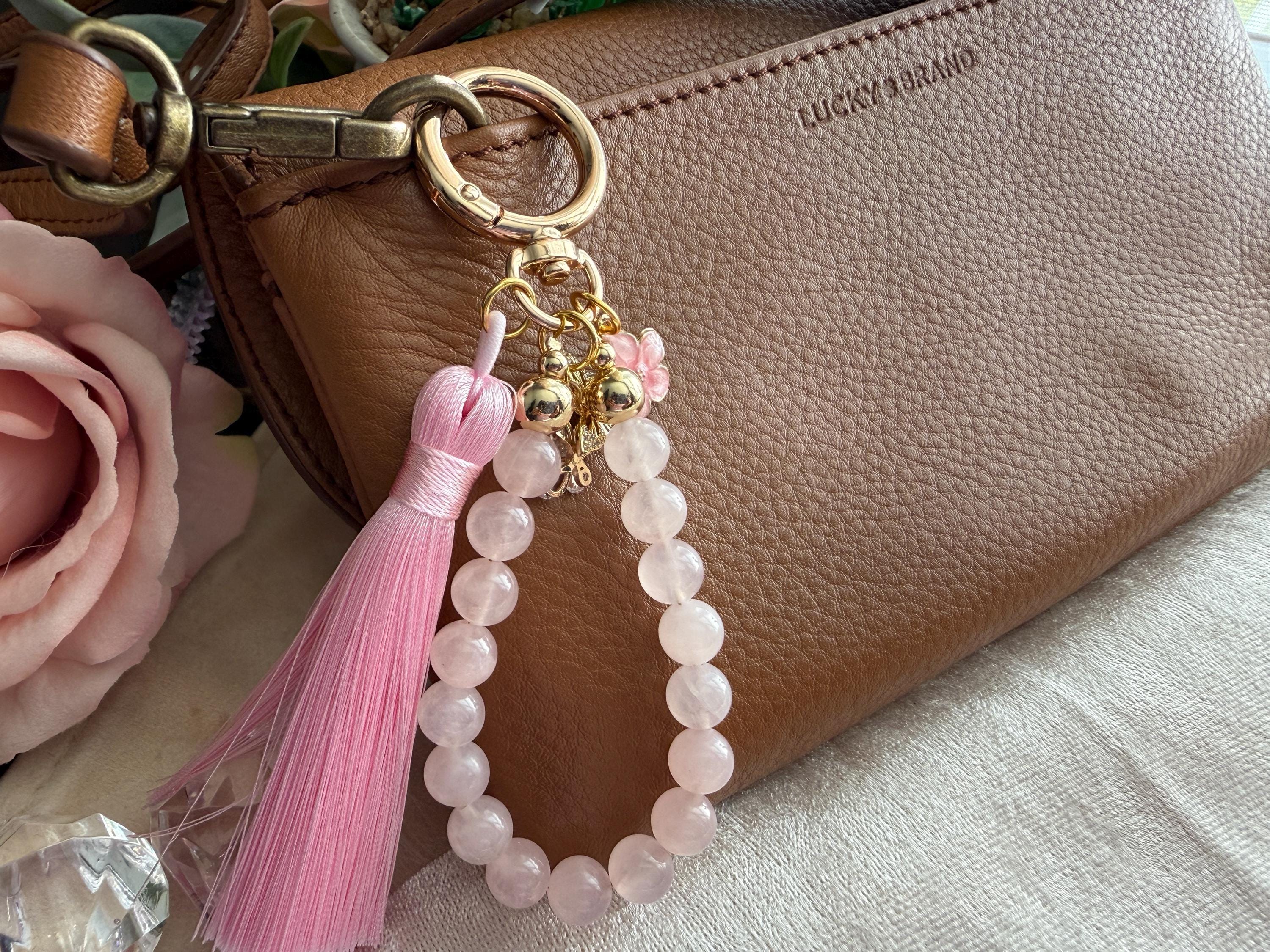 Add a touch of charm and sparkle to your purse, tote, backpack, or keys with this handcrafted gemstone purse charm. Made with Rose quartz beads, a silky matching tassel, and premium gold-tone hardware, this piece brings a soft, feminine elegance to any accessory.