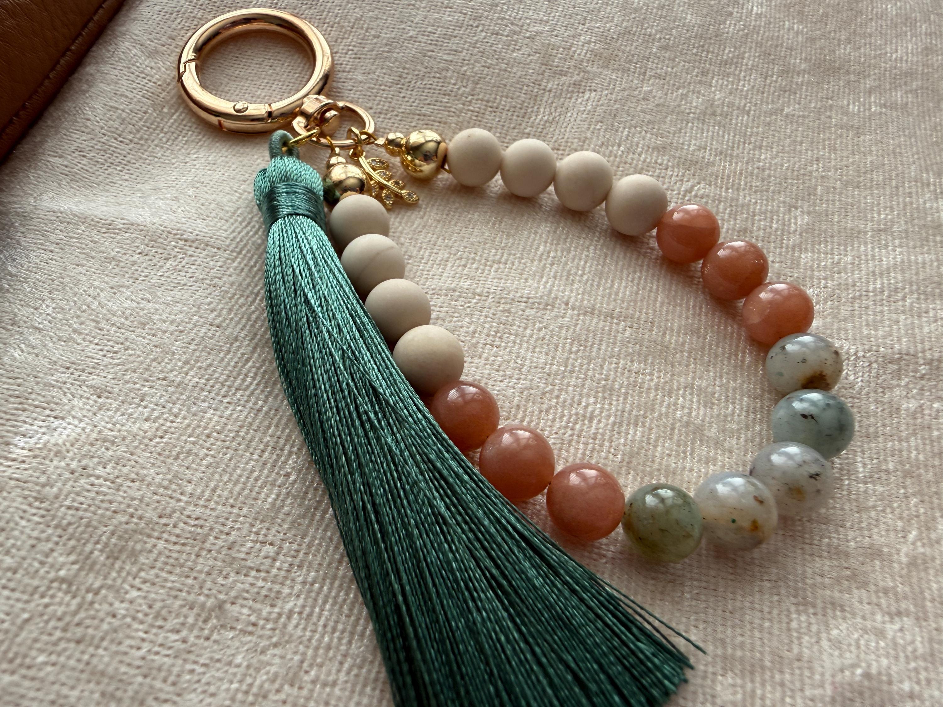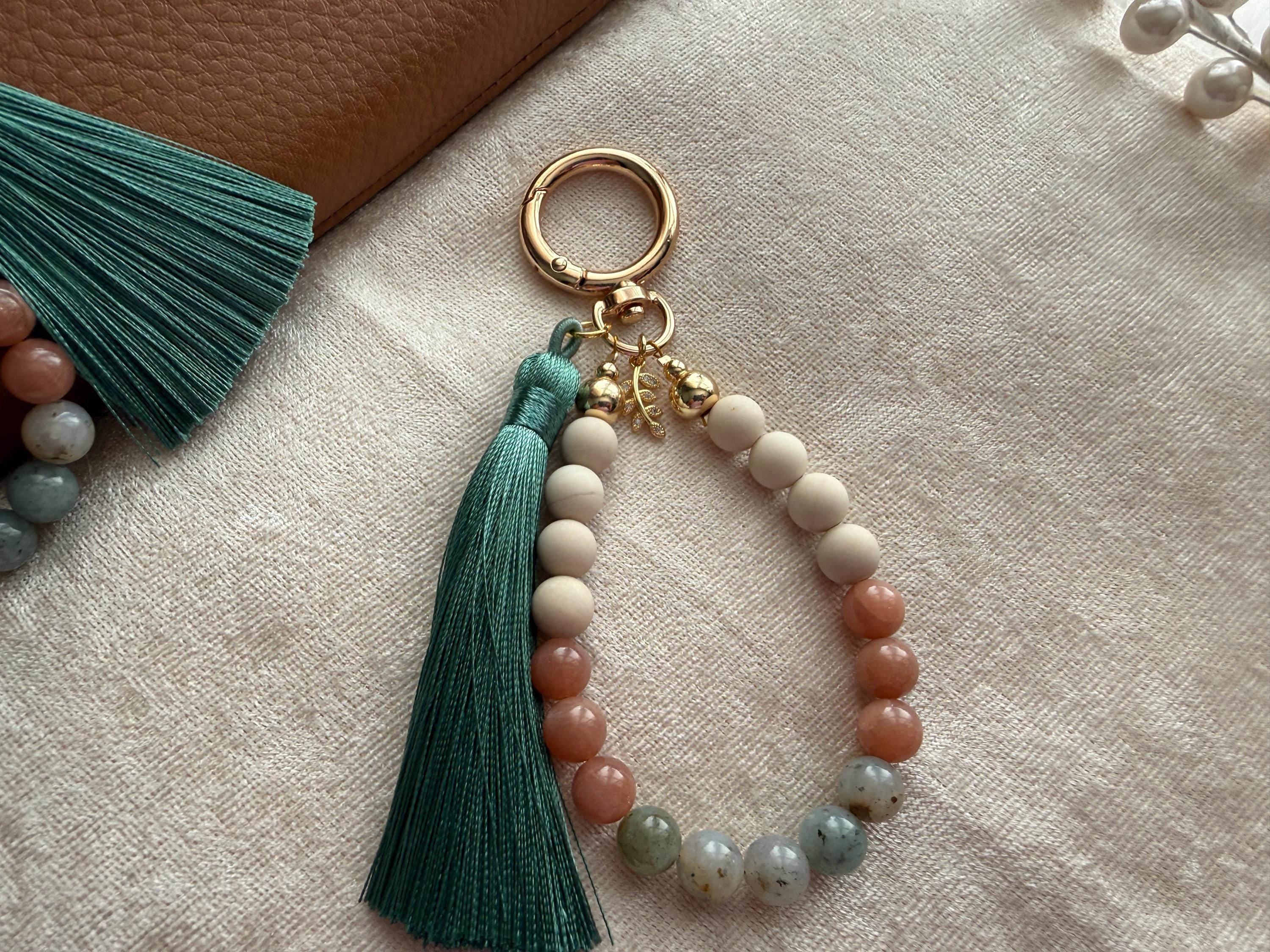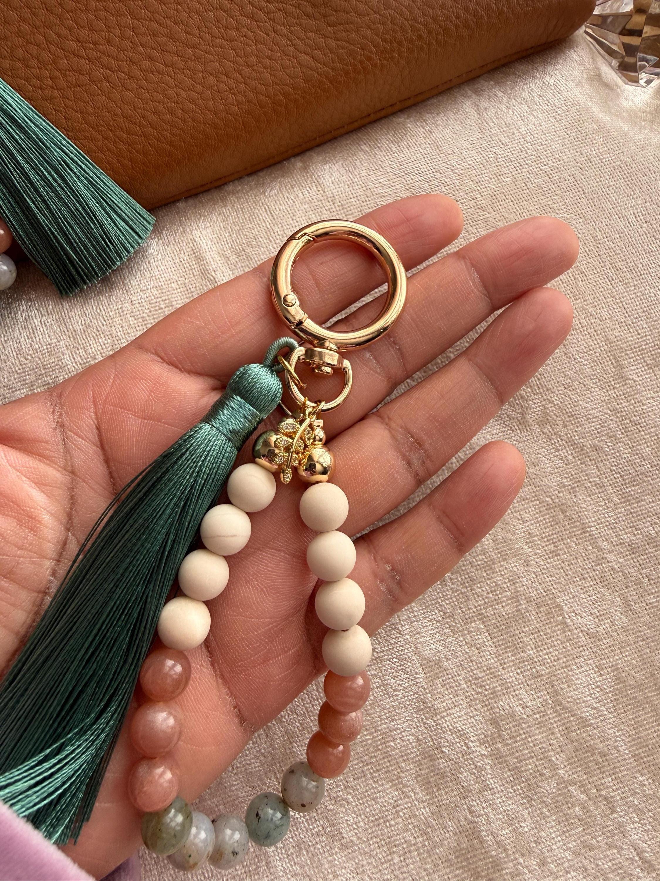 Add a touch of charm and sparkle to your purse, tote, backpack, or keys with this handcrafted gemstone purse charm. Made with a mix of peach moonstone, moss chalcedony, matte ivory jade beads, a silky matching tassel, and premium gold-tone hardware, this piece brings boho vibes to your accessories.