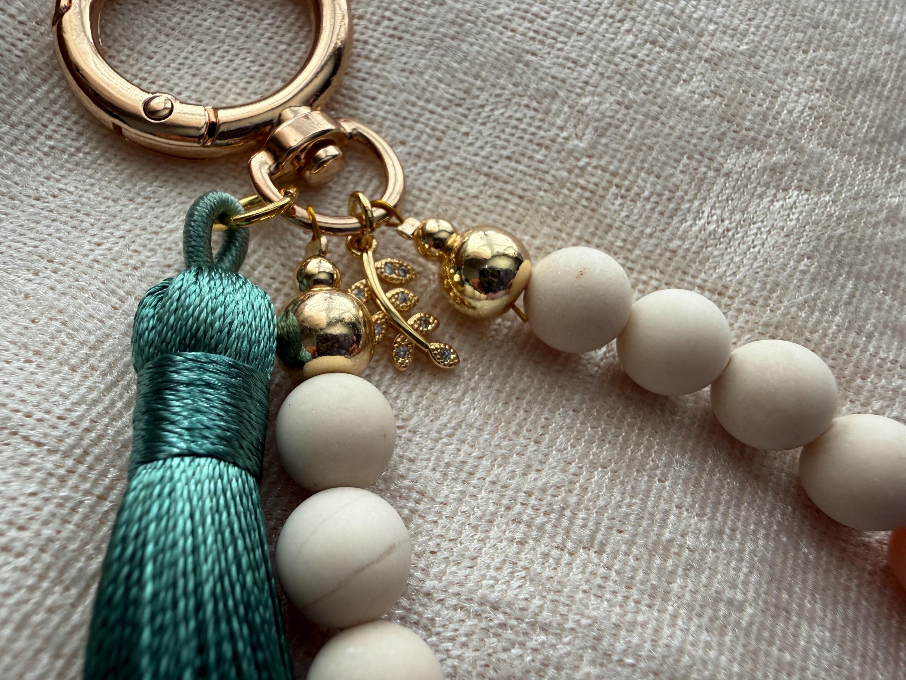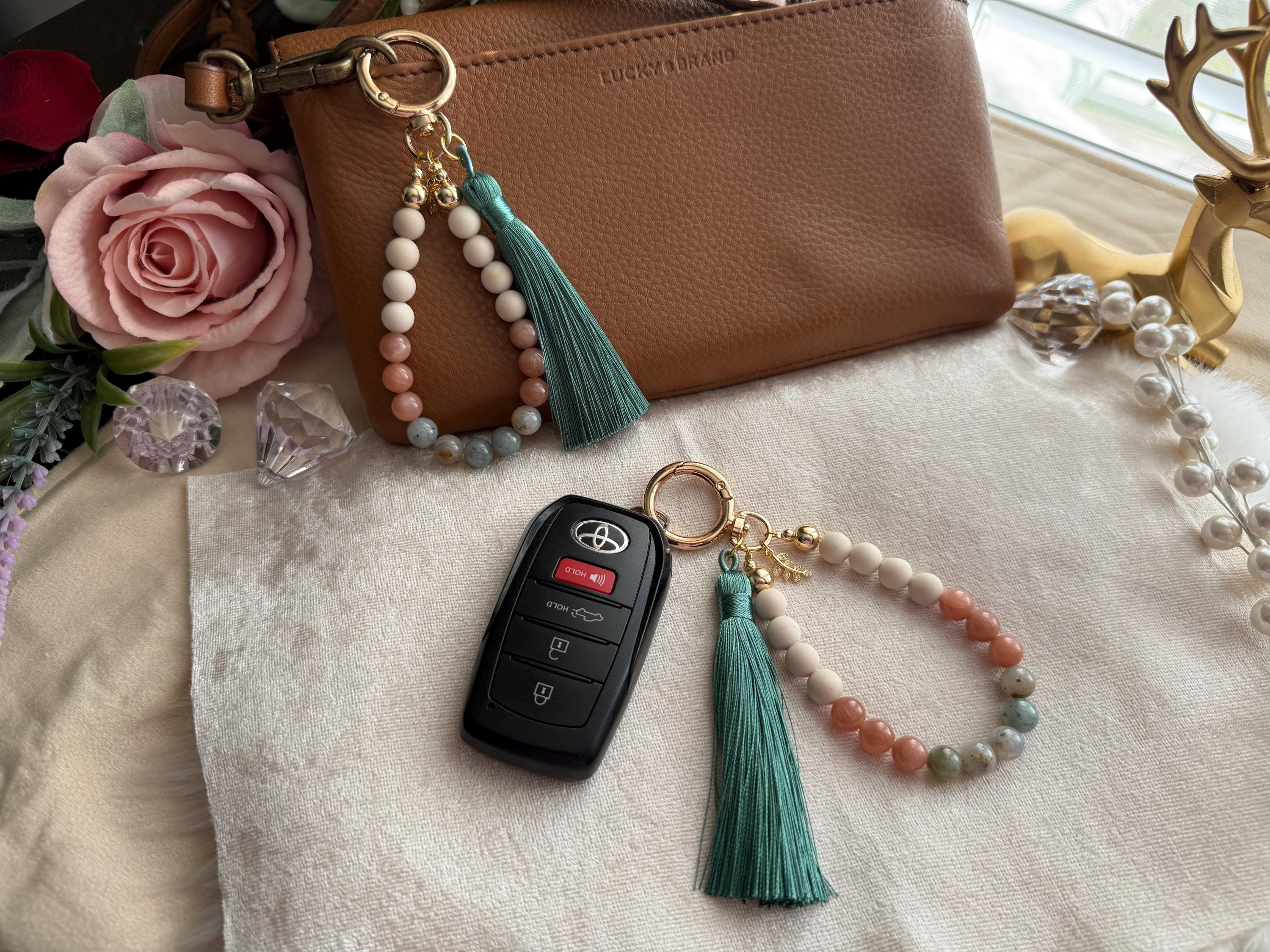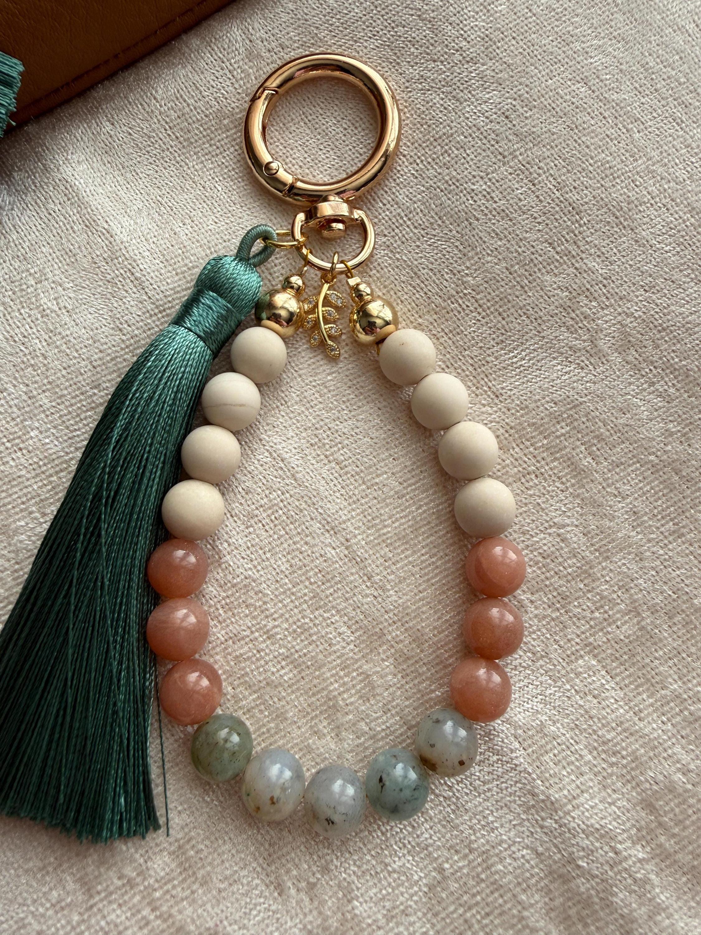 Add a touch of charm and sparkle to your purse, tote, backpack, or keys with this handcrafted gemstone purse charm. Made with a mix of peach moonstone, moss chalcedony, matte ivory jade beads, a silky matching tassel, and premium gold-tone hardware, this piece brings boho vibes to your accessories.